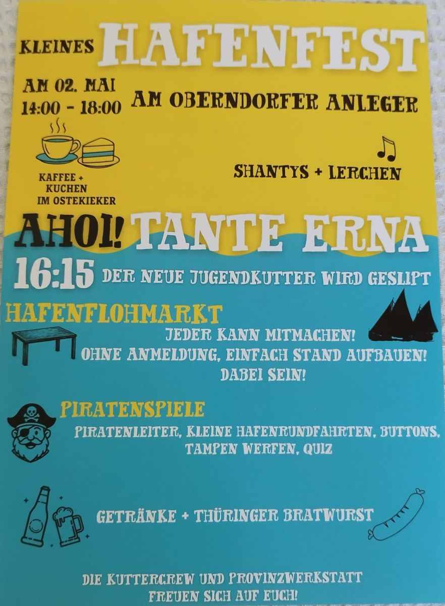Die Kuttercrew und die Provinzwerkstatt laden am 2. Mai 2026 von 14 bis 18 Uhr zum Kleinen Hafenfest am Oberndorfer Anleger ein.